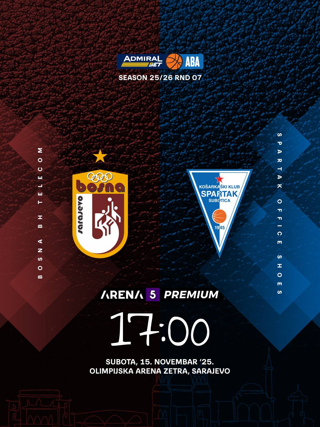 Najava utakmice 7. kola AdmiralBet ABA lige: KK Bosna BH Telecom – KK Spartak Office Shoes koja će se odigrati u subotu 15.11.2025. godine od 17h.