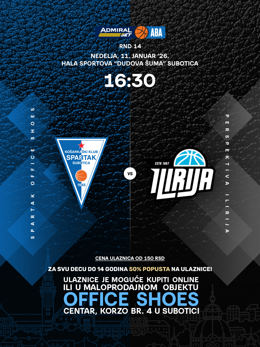 PRESS KONFERENCIJA POVODOM 14. KOLA ADMIRALBET ABA LIGE 10/01/2026 Utakmica 14. kola AdmiralBet ABA lige protiv ekipe PERSPEKTIVA ILIRIJA zakazana je za nedelju 11.1.2026. godine sa početkom u 16:30h u hali sportova Dudova šuma, Subotica. Vaše ulaznice možete kupiti online putem linka https://ulaznice.kkspartak.rs/utakmica/spartak-office-shoes-ilirija/71 ili u maloprodajnom objektu OFFICE SHOES – CENTAR na adresi Korzo 4, Subotica. Na press konferenciji povodom 14. utakmice AdmiralBet ABA lige, govorili su naš trener Vladimir Jovanović kao i Luka Cerovina:
