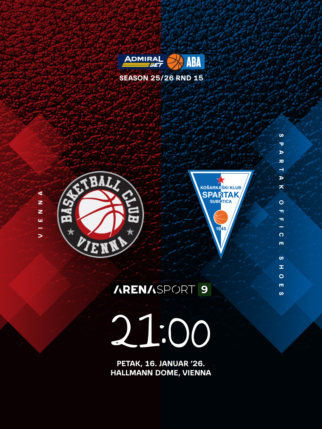 Najava utakmice 15. kola AdmiralBet ABA lige: KK Vienna – KK Spartak Office Shoes koja će se odigrati u petak 16.1.2026. godine od 21h.