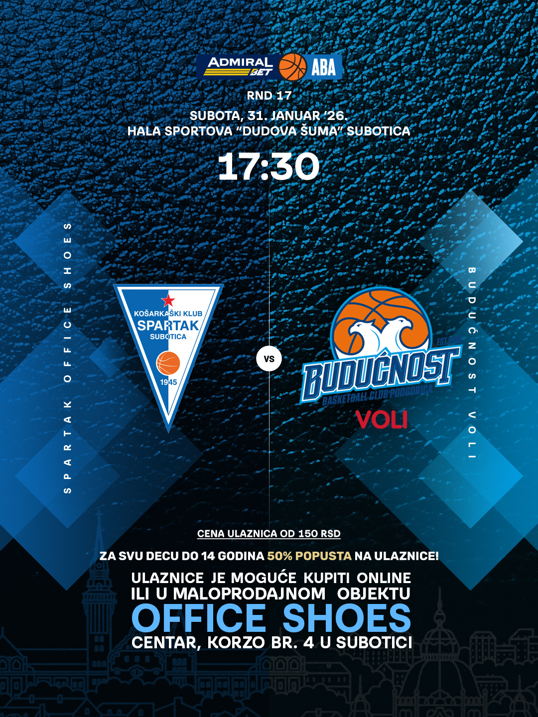 PRESS KONFERENCIJA POVODOM 17. KOLA ADMIRALBET ABA LIGE 29/01/2026 Utakmica 17. kola AdmiralBet ABA lige protiv ekipe BUDUĆNOST VOLI zakazana je za subotu 31.1.2026. godine sa početkom u 17:30h u hali sportova Dudova šuma, Subotica. Vaše ulaznice možete kupiti online putem linka https://ulaznice.kkspartak.rs/utakmica/spartak-office-shoes-buducnost-voli/72 ili u maloprodajnom objektu OFFICE SHOES – CENTAR na adresi Korzo 4, Subotica. Na press konferenciji povodom 17. utakmice AdmiralBet ABA lige, govorili su naš trener Vladimir Jovanović kao i Vojin Medarević: